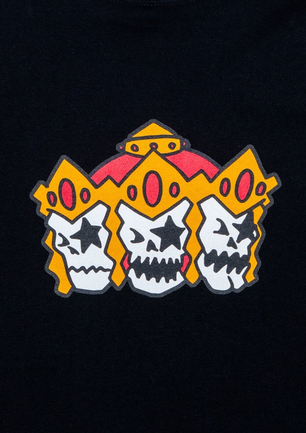 キン肉マン × MxMxM初の超人“アシュラマン”が登場! アシュラマンの顔がMxMxMドクロに変身し、 6つの手はMxMxMのハンドサインである集中! マジカル モッシュ アシュラマンTシャツです。 何事も集中は大事だぞ!かーっかっかっかっか