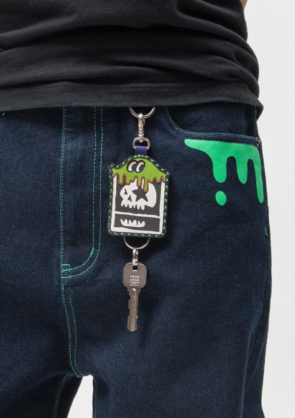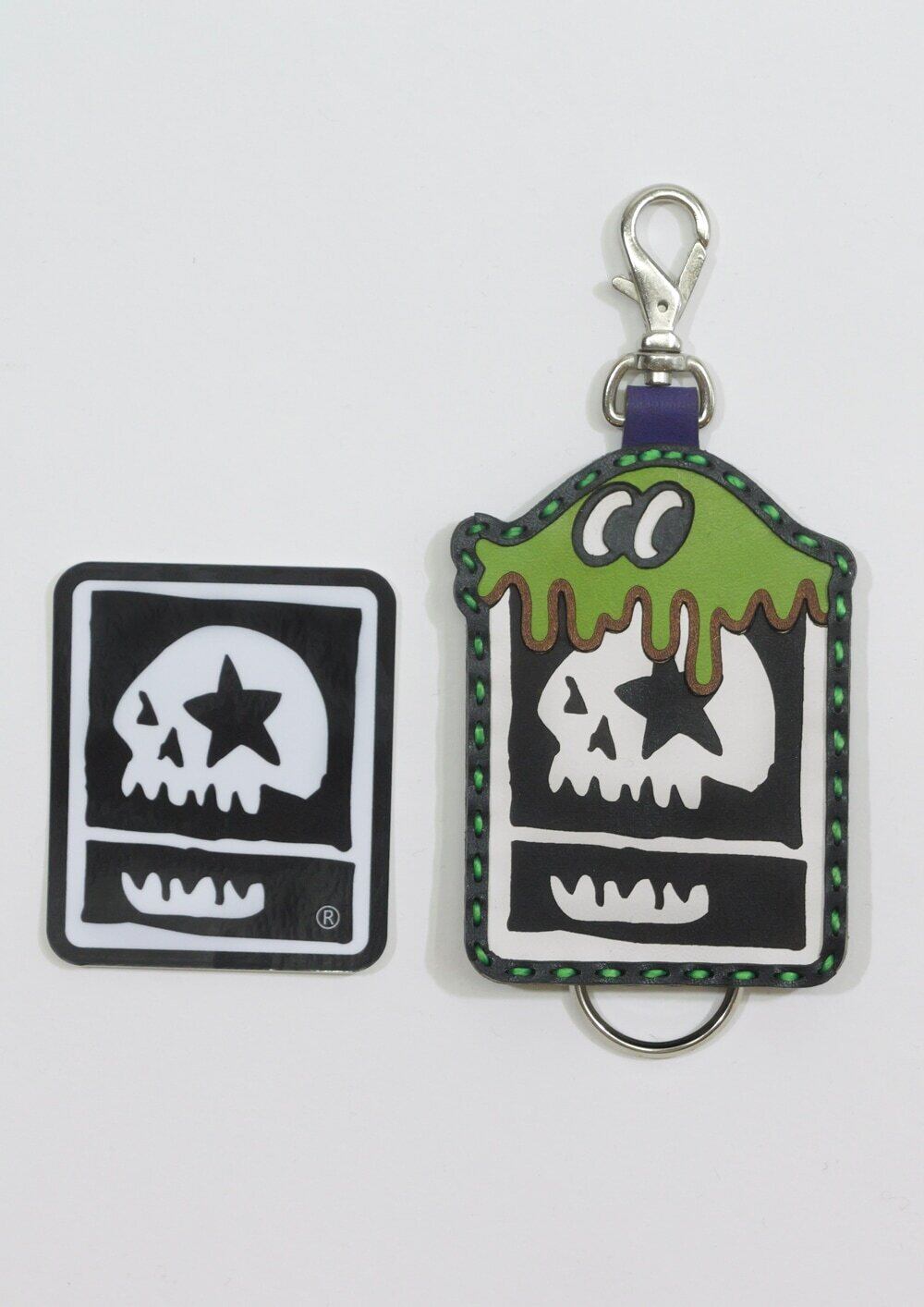 本革で仕上げたMxMxMドクロに“どろどろスライムちゃん”が垂れかかるデザイン。 バックにはMxMxMドクロの刻印。