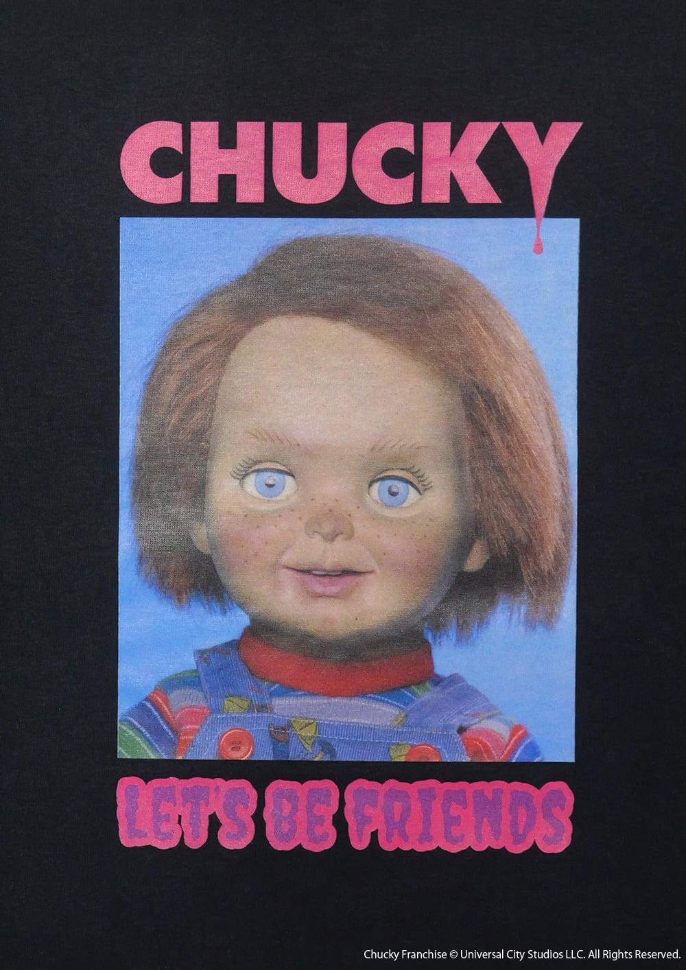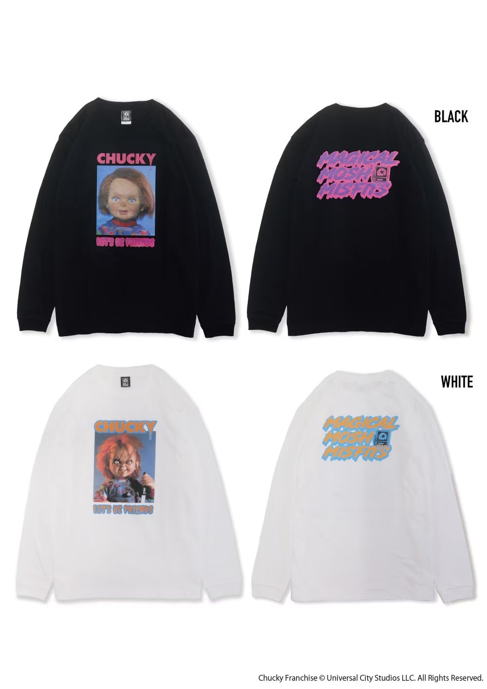 「LET'S BE FRIENDS」(友達になろう) チャッキーからの不気味なメッセージを添えて、 “善と悪の二面性”を楽しめるLONG TEEです。