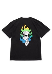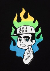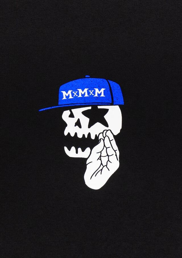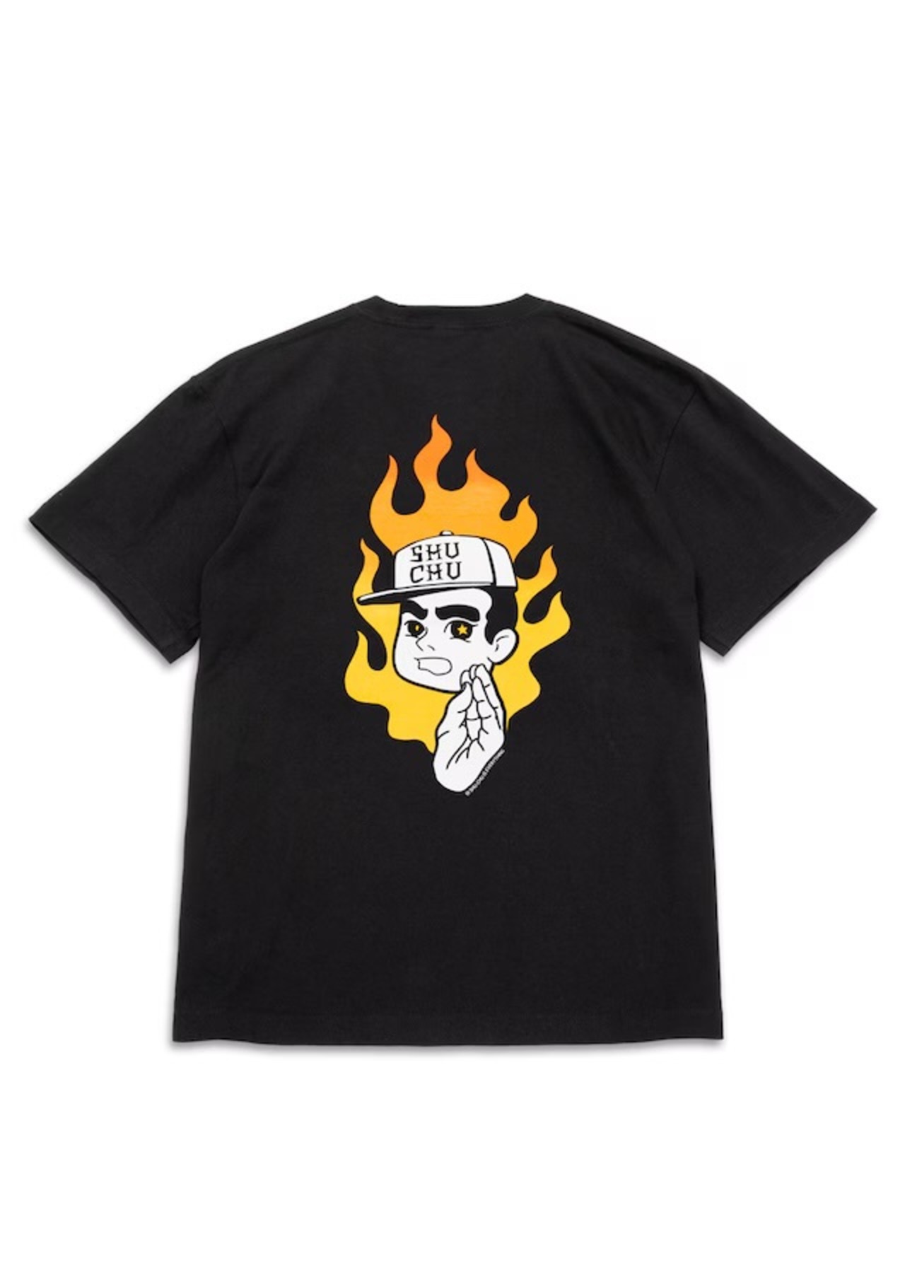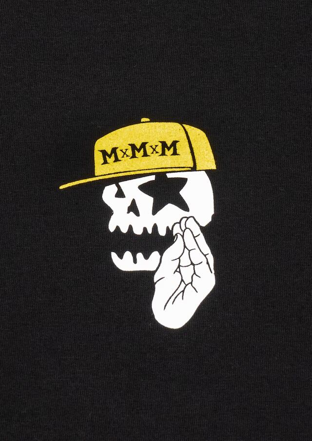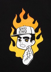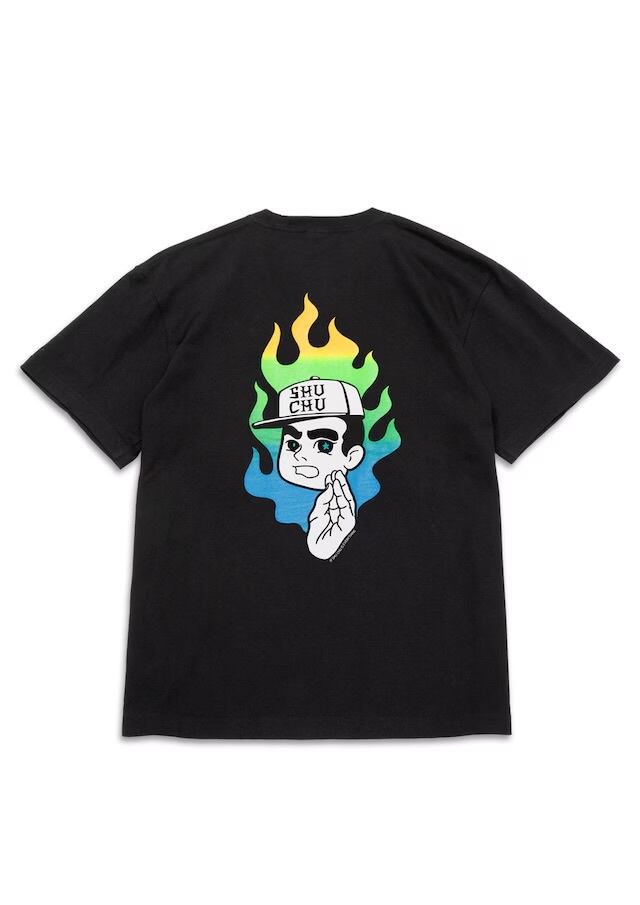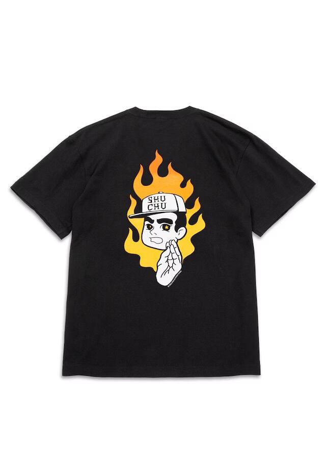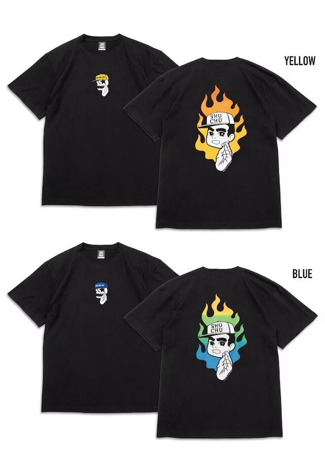 MxMxMのハンドサインである集中ポーズの“MxMxMドクロ”に、 メラメラと燃えるグラデーションFIREと“しゅうくん”の 「何事も集中が大事」というメッセージを込めたTシャツ。
